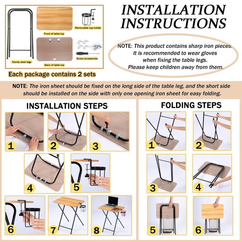 • Complete Set for Convenience: includes 2 folding TV tray tables (23.62"x15.75"x26"), spacious for dining, working, or relaxing; With 2 movable cupholders (3.94"x4.33"), easy to attach to sturdy surfaces via screw knob, ideal for drinks like coffee, tea