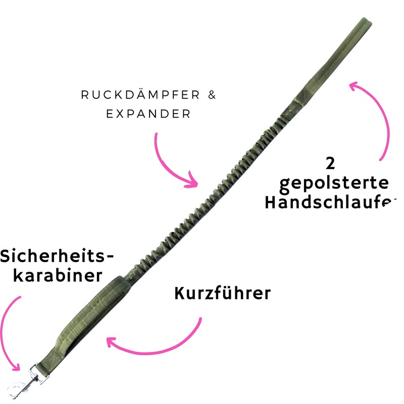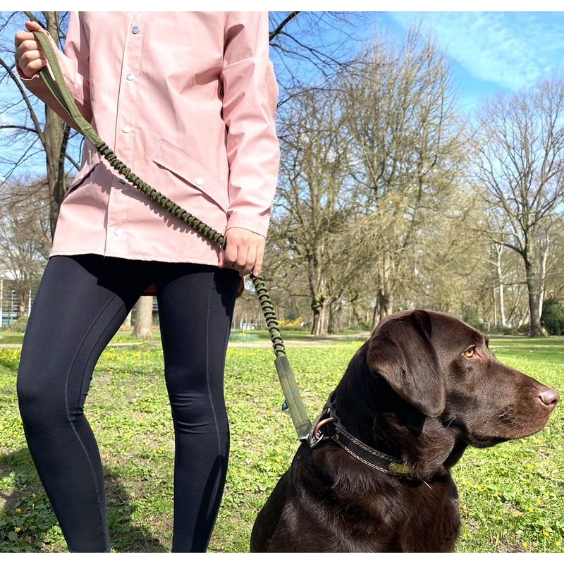 - Quality: the dog lead is equipped with chrome-plated swivel carabiner made of a heavy-duty alloy, which can be rotated 360°. The dog bungee lead has a variety of properties (lightweight, tear-resistant, strong, stable, robust, safe, bite-resistant). Available in black, olive green, brown and petrol blue.