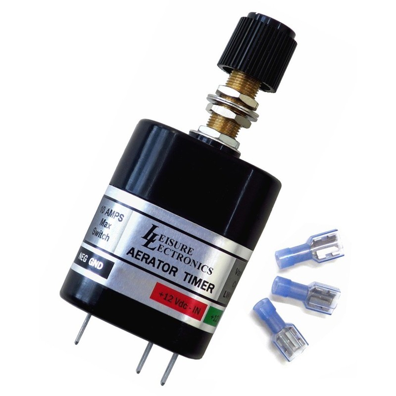 Designed for marine use. Control is fast and simple: Just turn the knob. Runs your pump for 30 seconds with pauses adjustable from 5 Seconds to 5 Minutes. Or clicks Off. MADE IN U.S.A. by Leisure Lectronics, the leading manufacturer of aerator pump timers.