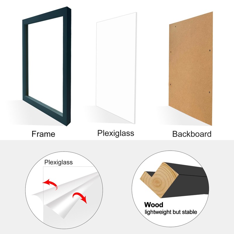 - ●Material: Modern style wood frames, lightweight but stable. The plexiglass have plastic film on both sides for protection, Not real glass, teel off easily. They won’t be break easily to make a horrible mess if you knock them down! Safe around the kids.