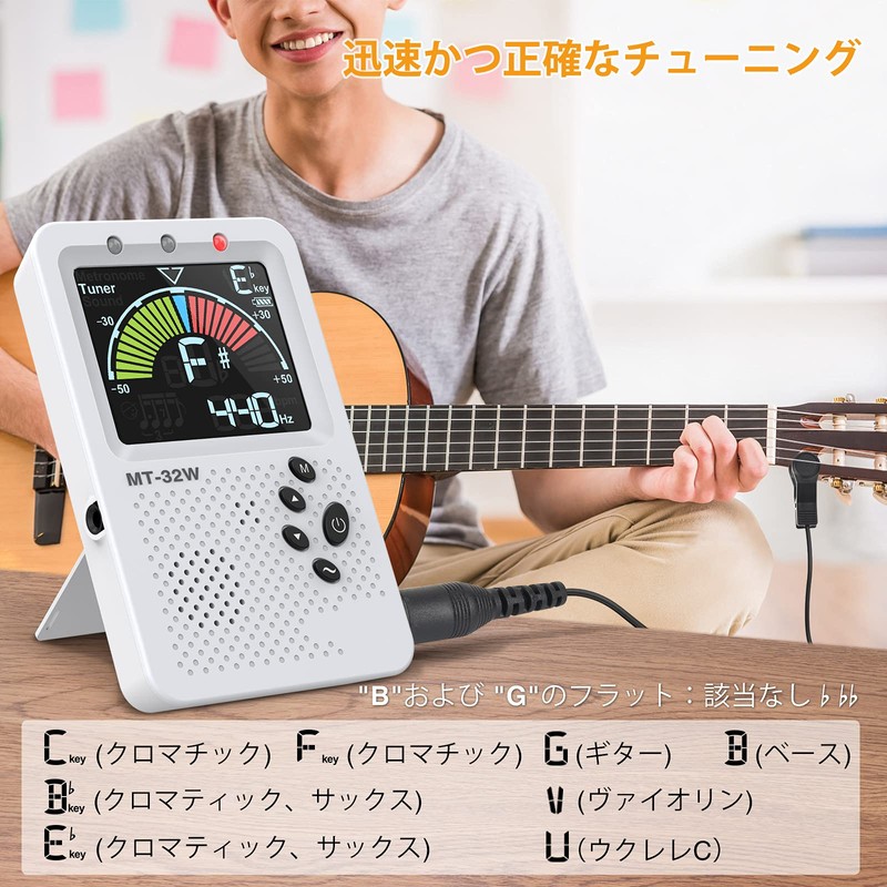 LEKATO Tuner with Metronome Mode, 3 in 1 Digital Guitar Bass Piano with Clip Mic Lightweight Metronome Pickup Clip Vocal Digital Beat Mode LED Color Display USB Charging Multifunctional Tuner (White)