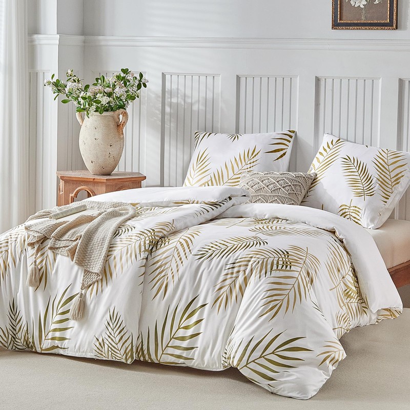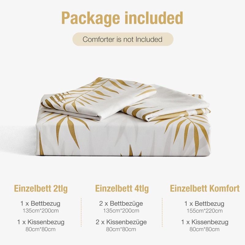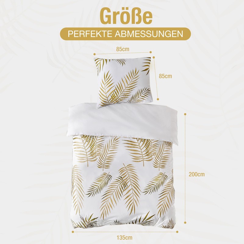 - Exotic bed linen 135 x 200 cm 4-piece: this double-sided printed bedding set impresses with golden palm leaves on a white duvet cover. The design combines natural freshness with luxurious flair and gives the bedroom an elegant and soothing