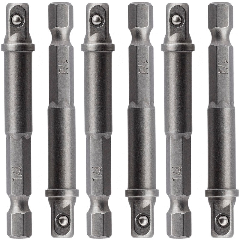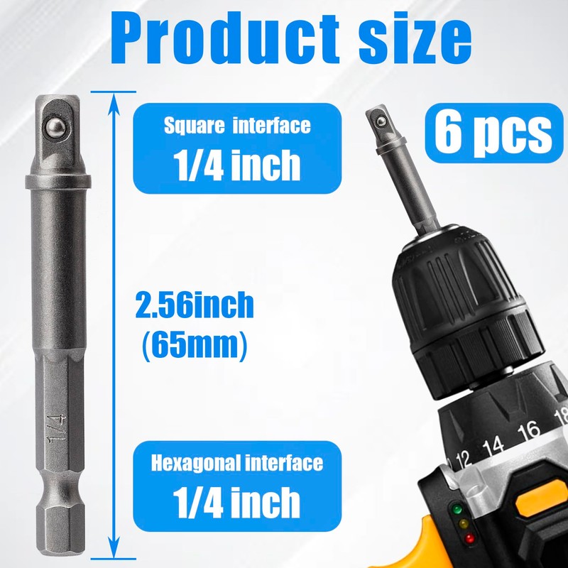 - What You Will Get: 6 pack 1/4" to 1/4" socket adapter are in the package. The length is 2.56 in/6.5 cm and the square drive tip size is 1/4 in, while the hexagonal shank size is 1/4 in