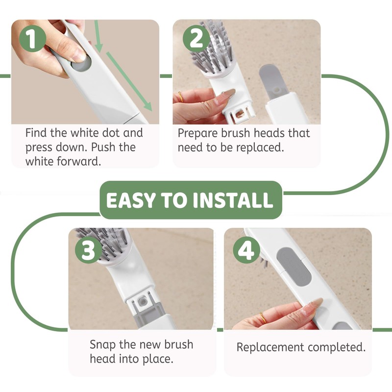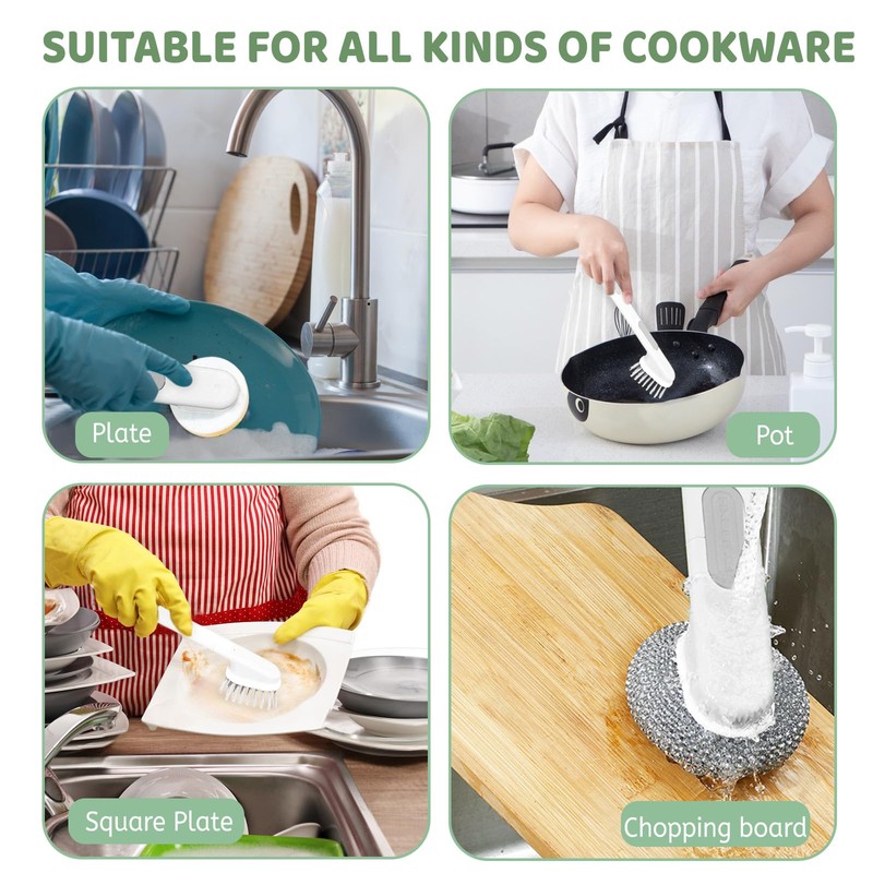 - 【Wide Application】The scrub brush for dishes is an ideal cleaning tool for dishes, pots and pans, tableware, sinks, stovetops, countertops, cutting boards and more. The 3 brush heads are durable and not easily deformed, and can effectively scrub away dirt, making your kitchen cleaning work easier!
