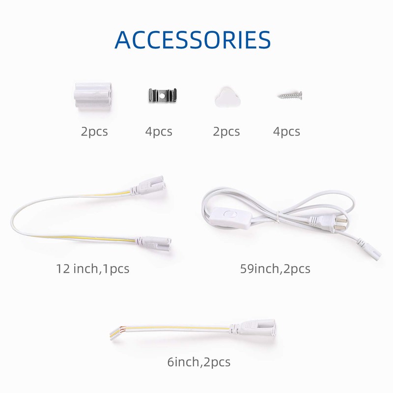 - You Will Get - 4 x LELEJU T5 5W 1FT LED Shop light,4 x 59inch Power cords with On/Off Switch,4 x 6inch Hardwire power cords,3 x 12-inch Serial connector, and other necessary accessories for installation.
