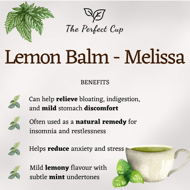 - Enjoy the gentle flavour of lemon balm in every cup. Our loose tea is crafted from pure lemon balm leaf, delivering a fresh, slightly citrusy infusion ideal as a relaxing herbal tea.