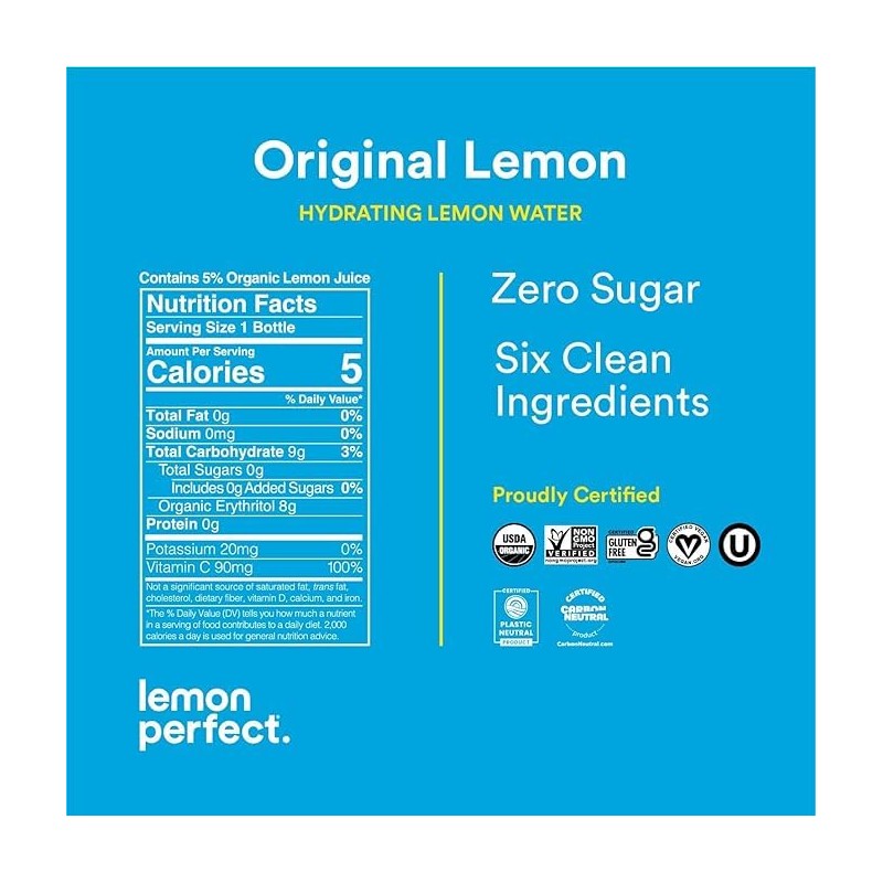 - Zero sugar: With five calories, zero sugar, and no artificial flavors or sweeteners, Lemon Perfect bottled water is not only delicious and refreshing — with ingredients you can feel good about — but also low glycemic and fast-friendly.