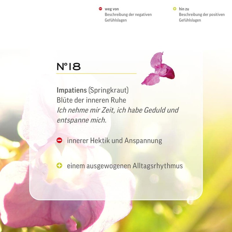 The Secret of Bach Flowers: Edward Bach, the founder of the Bach Flower doctrine, was convinced that the causes of a multitude of ailments lie in a disturbed mental balance and certain plants and trees as well as a rock water have the power to influence exactly that balance. From a basic stock of 37 flowers of wild-growing plants and trees as well as a rock water, he developed the Bach flower system with its 38 soul qualities, strength formulas and individual essences. Each individual flower essence defined by Edward Bach can be very precisely assigned to a soul state and can have a balancing and harmonising effect on it.