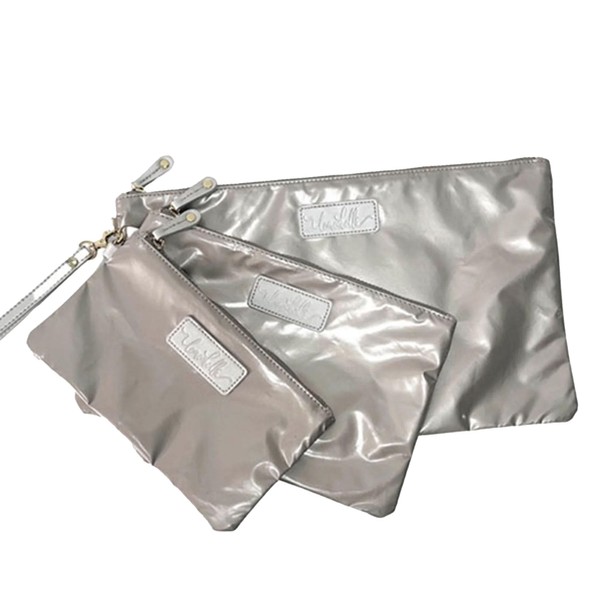 lemonbella Medium Carly Trio Pouch Set 3 Nylon Quilted Metallic Organization Bag with Wristlet - Versatile for Travel, Cosmetics, Tech, and Everyday Essentials, Champagne