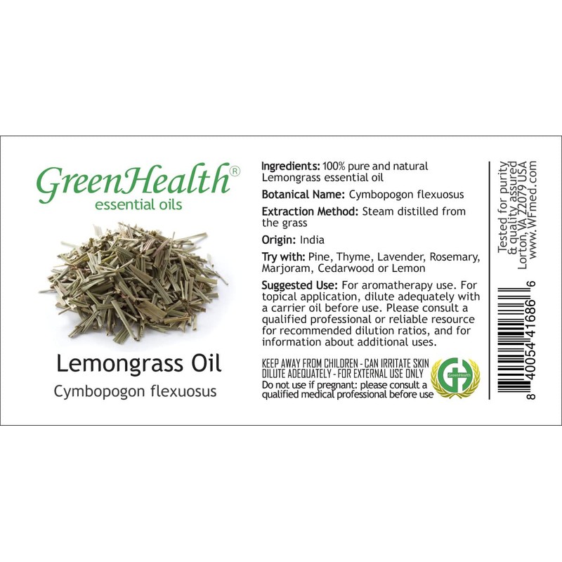- GreenHealth Lemongrass is 100% pure & natural essential oil, steam distilled from Cymbopogon flexuosus grass. You can try blending it with Pine, Thyme, Lavender, Rosemary, Marjoram, Cedarwood and Lemon.
