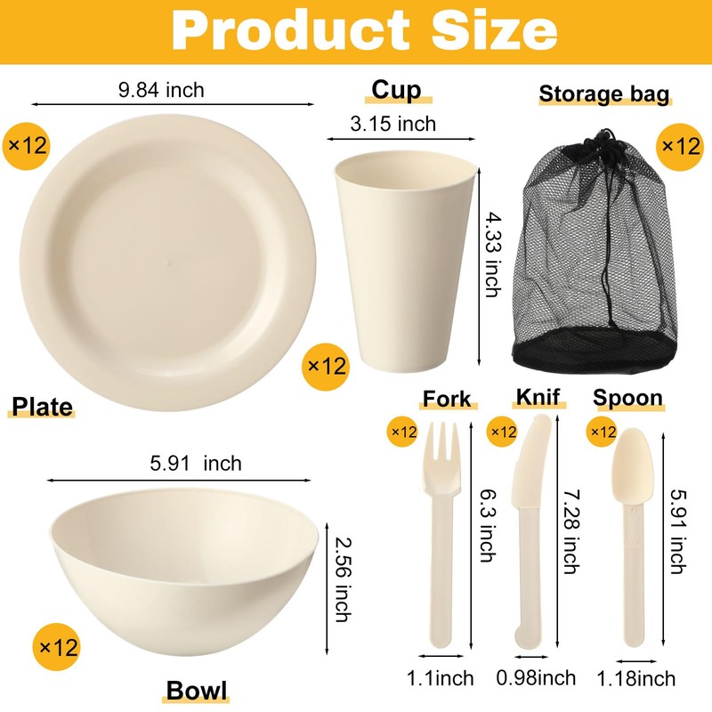 Everything you need is in one set, with enough quantity for 12 people, our reusable tableware is suitable for various occasions, use as a family tableware set or for a camping plate, cup and bowl set and more, saving time and money