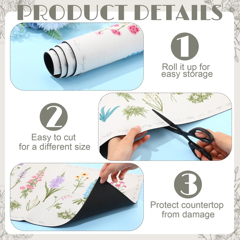 - You Will Receive: the flower dish drying mat set can easily simplify your kitchen tasks; Sized to fit various needs, the flower drying mat (15.75 x 23.62 inches), rectangular counter mat (3.94 x 19.69 inches), and faucet pad (3.94 x 14.96 inches) cater to all your drying requirements; Whether it's dishes or coffee gadgets, these mats ensure everything stays dry and organized