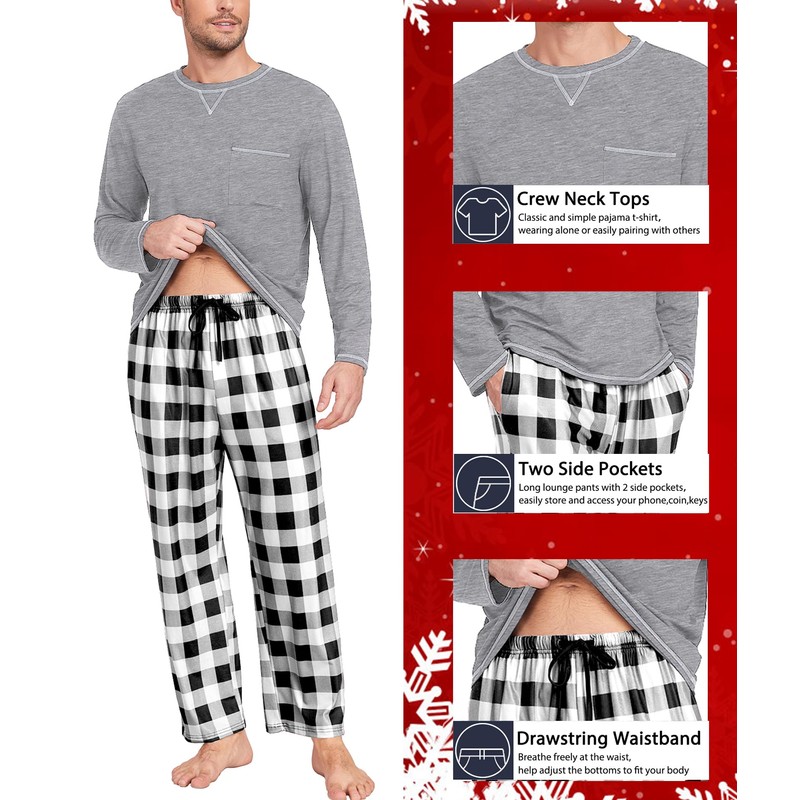 - 🎅🏻Practical Design - long sleeve pajamas with classic round neck pullover pajamas, the top features a contrasting color design on the neckline, pockets and cuffs for an unique look, the pants feature a classic Christmas buffalo plaid design that perfectly suits the Christmas holiday vibe, there are two pockets on both sides for easy access to your cell phone and keys, and the soft elasticized waist allows you to relax as much as possible!
