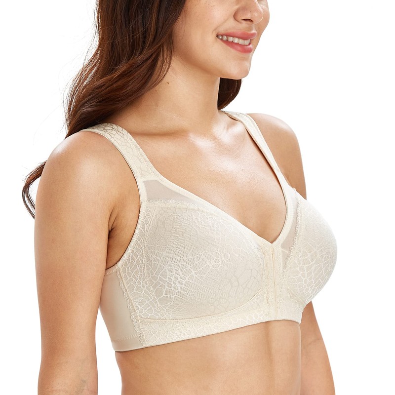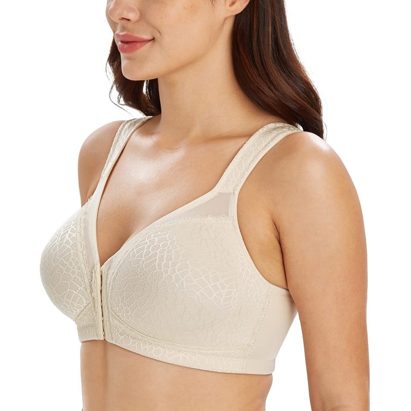 Lemorosy Women's Comfort Strong Hold Front Closure Back Support Unpadded Without Underwire Classic Bra, beige, 90D