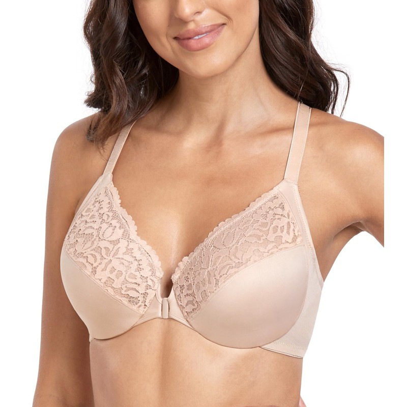 Lemorosy Women's Front Closure Bra Flower Lace T-Back Unpadded Plus Size Everyday Underwire(Beige,42DD)