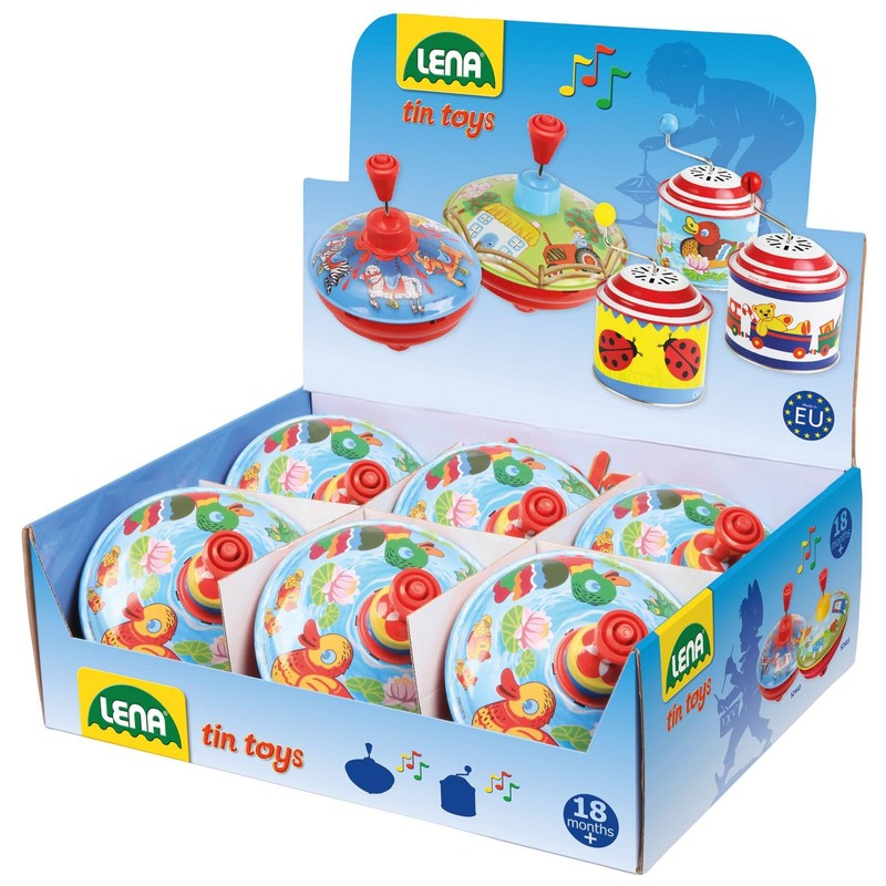 Lena 52410 Buzzing Spinning Top Ducks Diameter 14 cm, Metal Swing Spinner Made of Sheet Metal, Classic Pump Gyro, Tin Spinner with Animal Motif, Spinning Top with Standing Tip, Toy Spinner for
