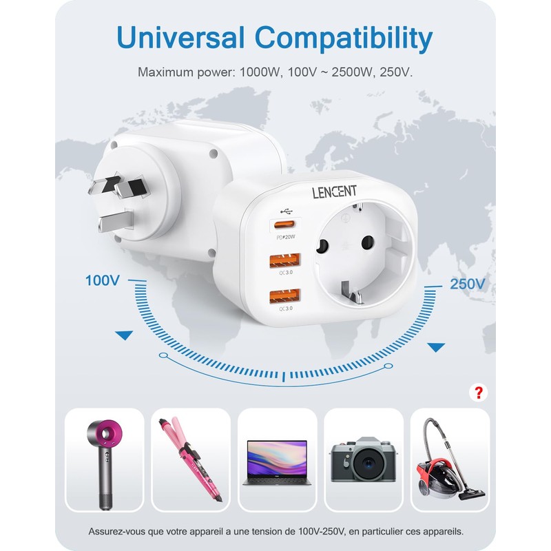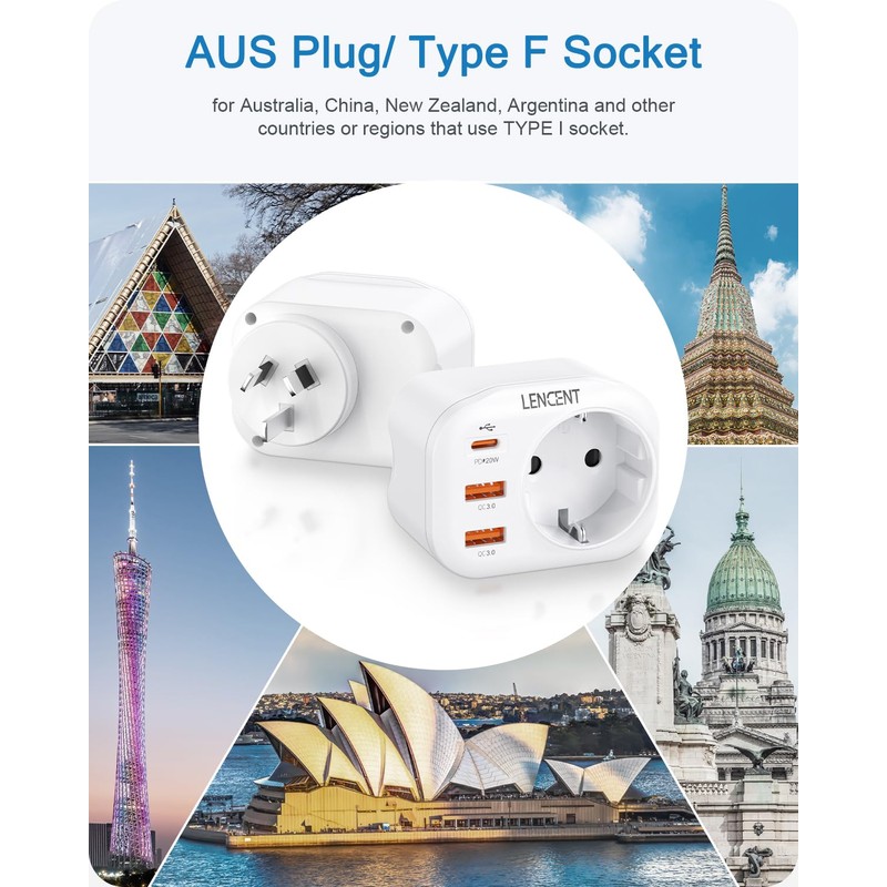 LENCENT LENCENT 2X Reiseadapter AU CN Netzadapter Australien China Deutschland Stecker, mit 2 USB QC3,0 + 1 Typ-C PD Ports, Typ I Reisestecker Stromadapter f??r Australia China Neuseeland Argentinien Steckdose