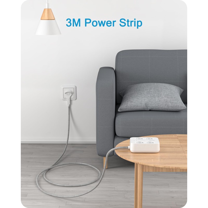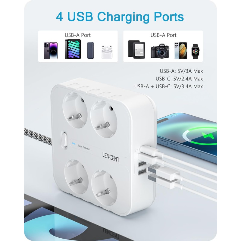 - ??8 in 1 Steckdosenleiste??Enth?lt 4 EU AC Steckdosen, 1 Typ-C & 3 USB-A Anschl1sse . AC-Steckdosen: Max. Leistung bis zu 2500 Watt (max. 250V, 10A). USB-A Ausgang: 5V/3A (max), USB-C Anschluss: 5V/2,4A (max). Diese USB Anschl1sse eignen sich f1r das Aufladen fast aller USB Ger?te. 3 Meter langes geflochtenes Kabel, 1,5 mm dicker Kupferdraht, tr?gt einen maximalen Strom von 10A, 2500W