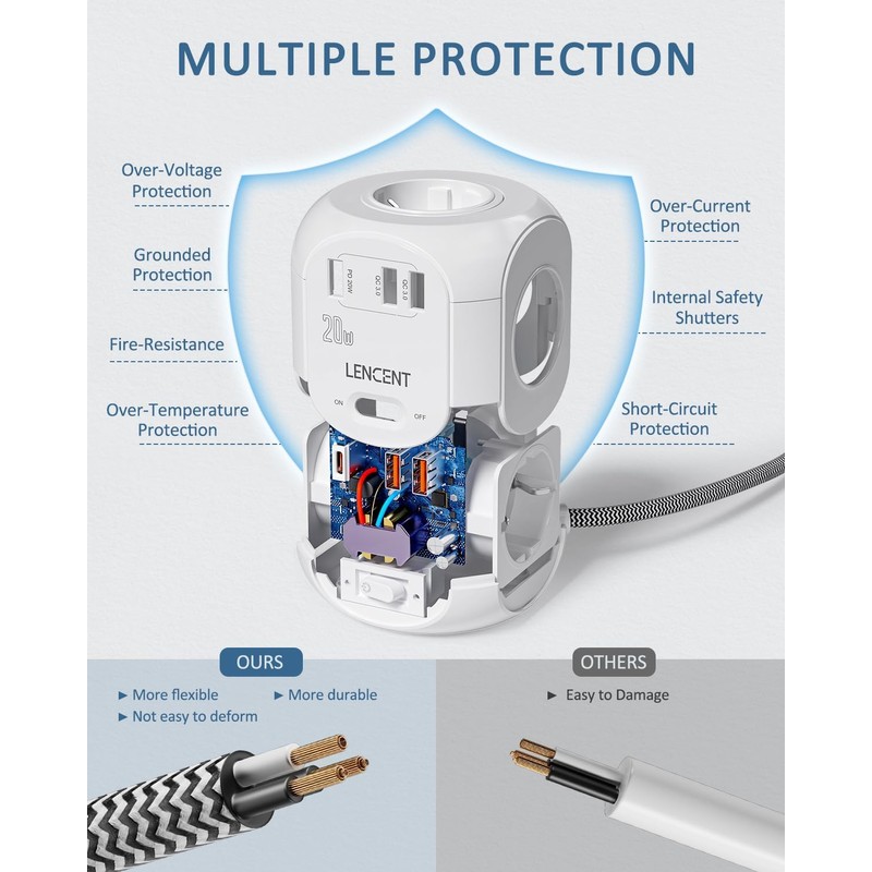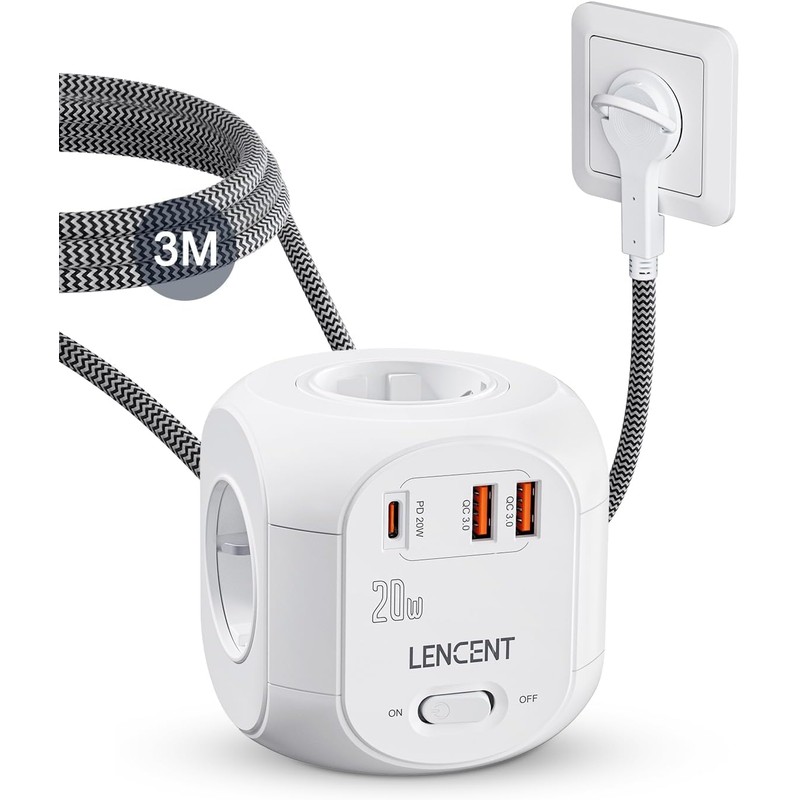 LENCENT LENCENT 4 Fach Steckdosenleiste Flachstecker Steckdosenwrfel Typ-C PD20W Mehrfachsteckdosen 7 in 1 Cube Steckdose mit 2USB3.0&1PD20W, Steckerleiste mit 3 Meter Geflochtenem Kabel fr Wandsteckdose