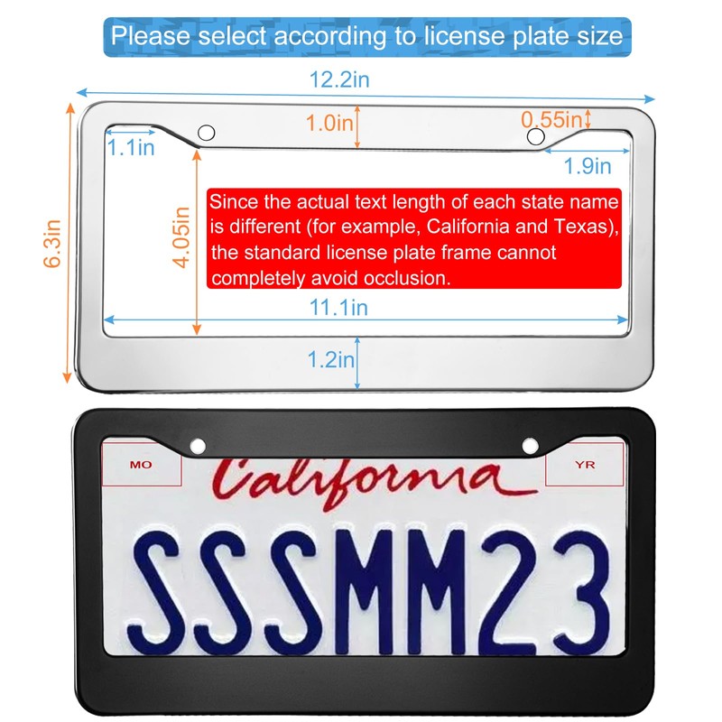 - Attention Please: Upgraded 2-hole silver license plate frames size 12.2IN X 6.3IN. Since the actual text length of each state name is different (for example, California and Texas), the standard license plate frame cannot completely avoid occlusion. The wide edge of the license plate frames are stronger and protect the license plate from bending