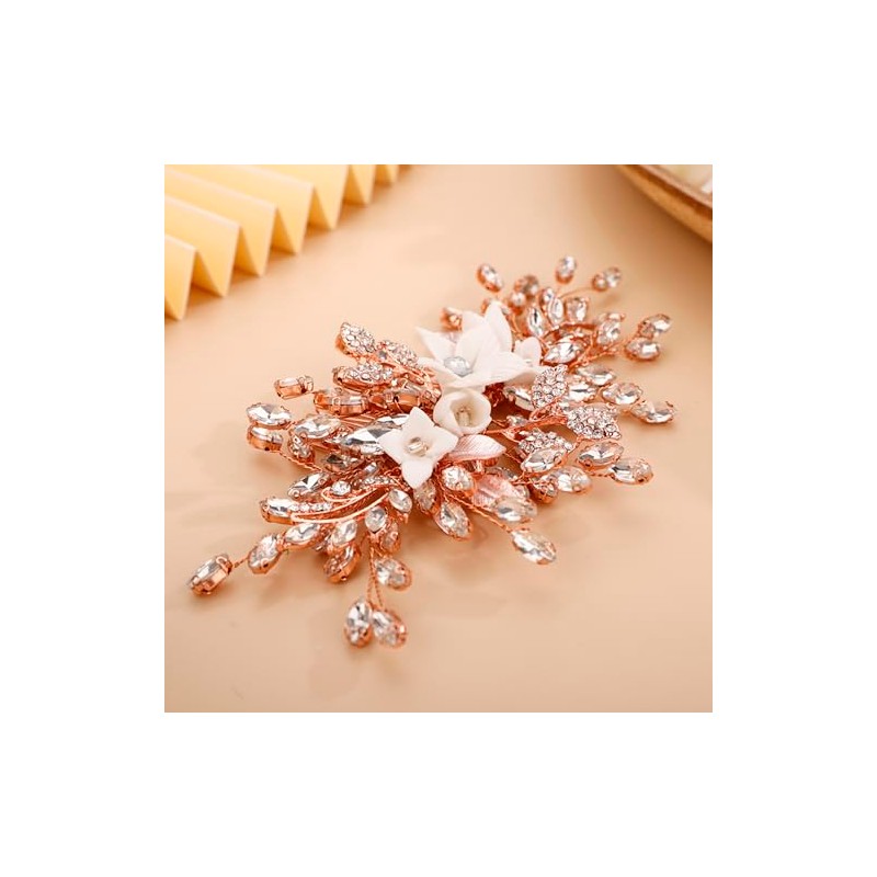Lenjicons Luxury Rhinestone Leaf Flower Hair Comb White Flower Rhinestone Wedding Headpiece Sparkling Crystal Leaf Hair Comb Handmade Crystal Hair Accessories for Women (rose gold)