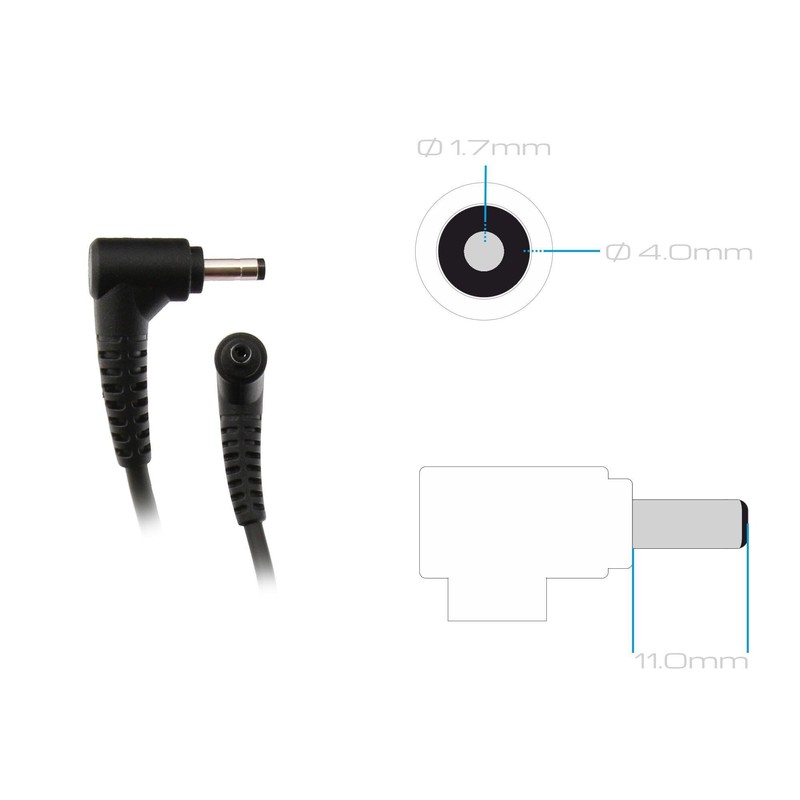 • Connector Type: Round, Connector Shape: 90° Angled, Male Outer Diameter: 4.0mm, Connector Inner Diameter: 1.7mm, Plug Length: 11.0mm, Pin in Connector: No, Length of Connection Cable from Power Supply to Notebook: Approx. 1.55 m