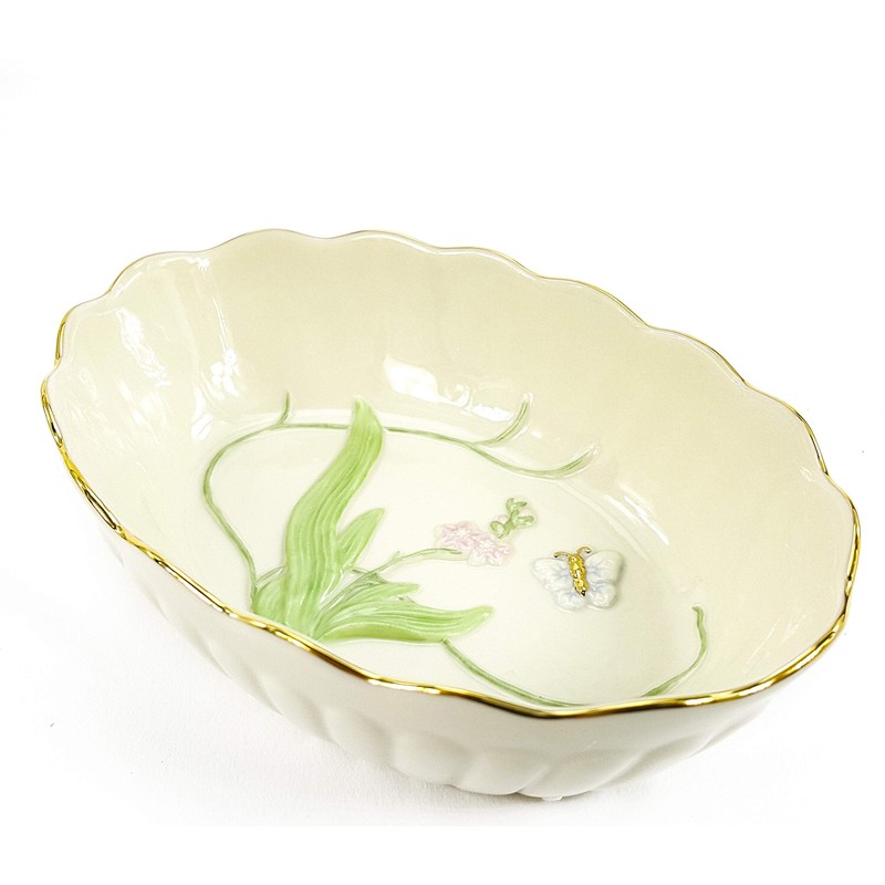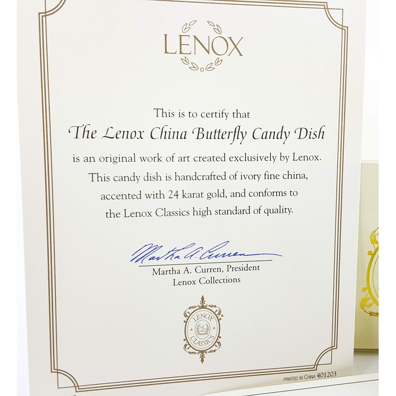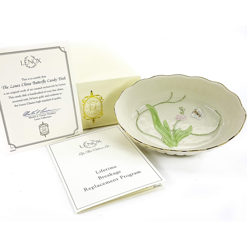 A blue butterfly and a pink flower are painted on the inside of the bowl. It has the Lenox 14kt gold emblem and name on the bottom and the scalloped rim is also 14kt.