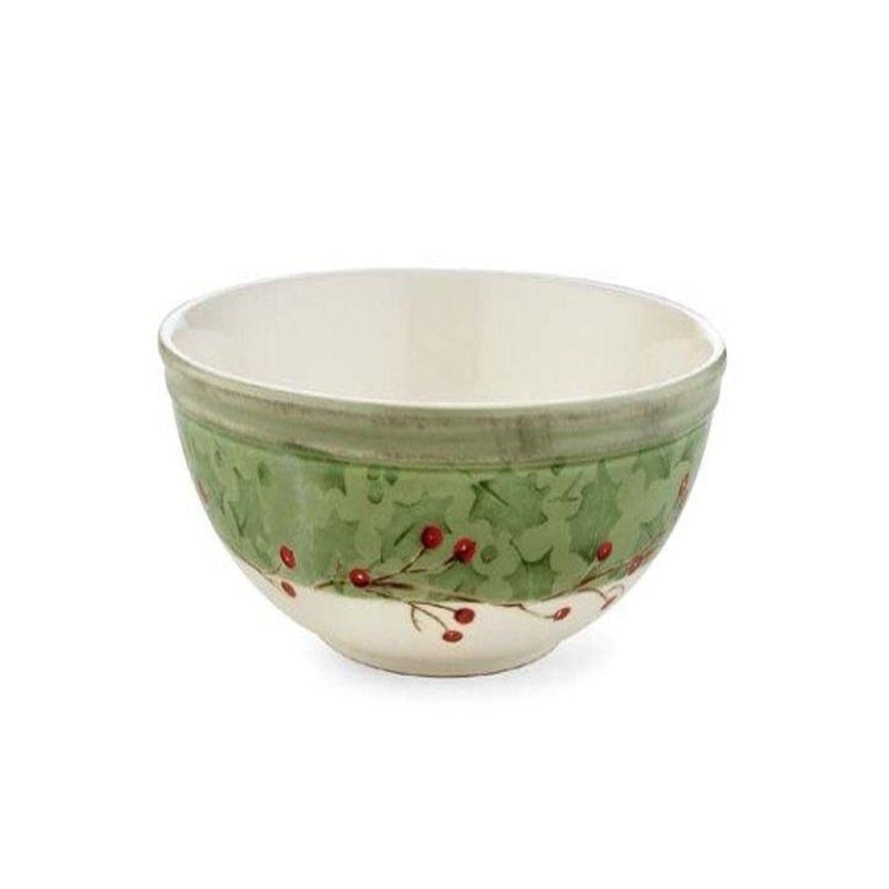 - Wide green border topped with leaves and a pattern of berries encircles the bowl
