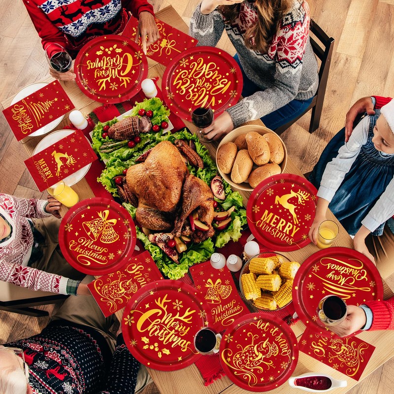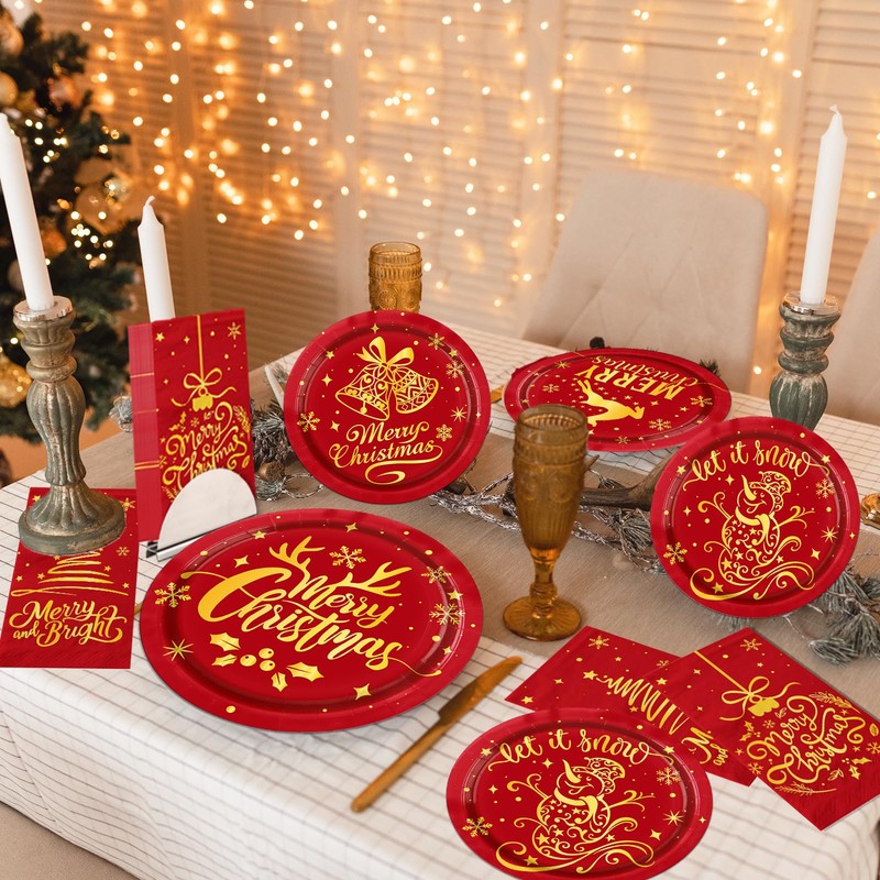 - CHRISTMAS PLATES & NAPKINS:Do you look for impressive red and gold Christmas paper goods set?This 60pcs red and gold Christmas dinnerware will meet all your needs.This Christmas party plates and napkins sets will be the center of attention at the Christmas party, your friends and customers will love it