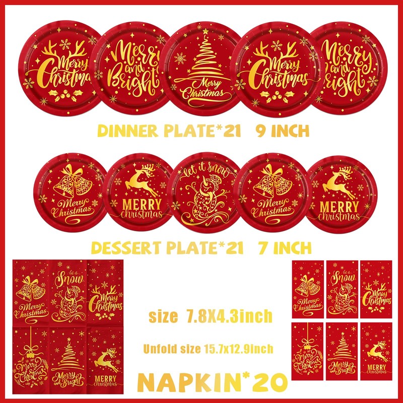 - PACKING INCLUDE:This merry Christmas plates and napkins serve for 20 guests include:21pcs 9inch ,21pcs Christmas dinner plates paper,7inch Xmas dessert plates,20pcs red and gold Christmas paper cocktail napkins