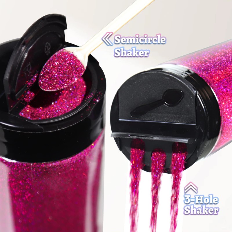 - Easy Pour Shaker Jar: Two kinds of shakers available on lid. One with 3-hole design, help sprinkle small amount of glitter evenly and well reduce waste. The other with semi-circular shape, support pour larger amount of glitter, also big enough to allow little spoons to enter and take out glitter.