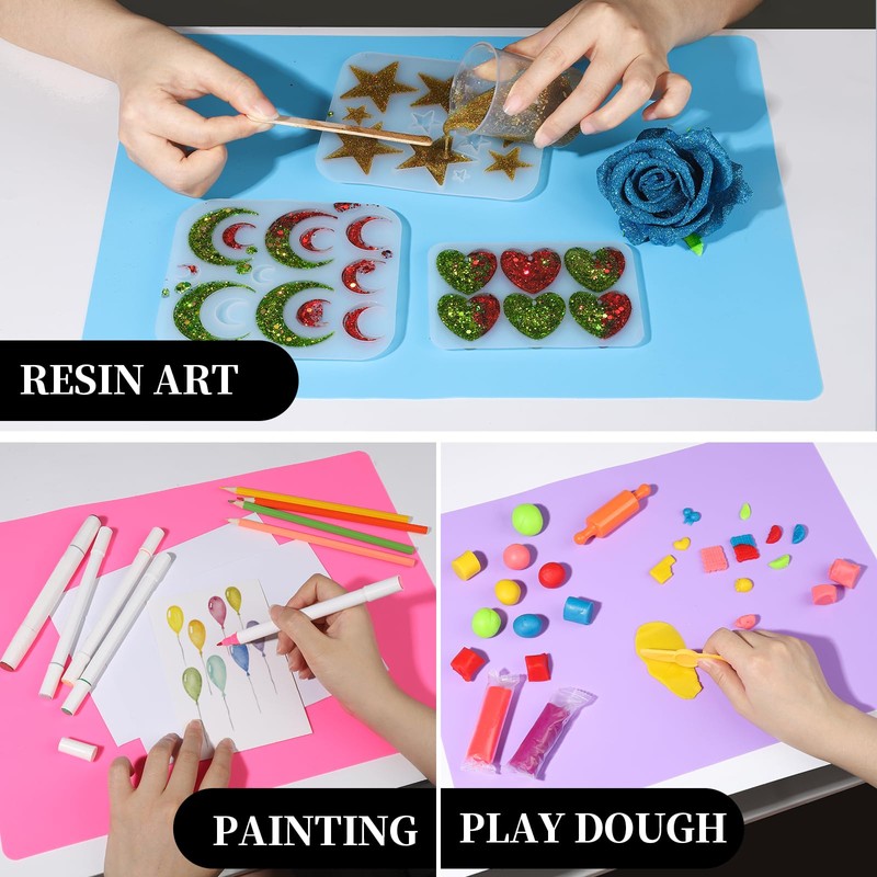 • Wide Applications: Perfect silicone mats for resin art projects, and other DIY arts and crafts, like making DIY jewelry, Christmas ornament or other handmade arts, playing dough, playing clay, glitter tumbler, delicate greeting cards, doing acrylic painting, paper quilling, making scrapbook, etc.. Also used as place mat, pastry mat, counter protector etc..