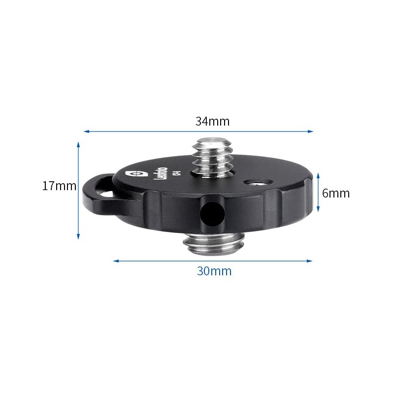 - Diameter: 1.2 inches (30 mm), Maximum Width: 1.3 inches (34 mm), Height: 0.7 inches (17 mm), Weight: 0.5 oz (15 g), Tripod Screw Standard: 3/8 inch male screw, 1/4 inch male screw hole conversion adapter, hex wrench