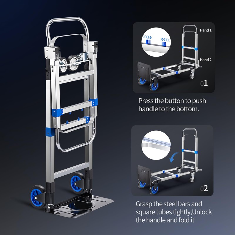 In their upright hand truck configuration, they function much like traditional hand trucks. They feature a nose plate that supports the load and a vertical frame that prevents items from falling off during transport. Users simply slide the nose plate under the load or stack it onto the plate, then tilt the truck back and balance it on its wheels for easy rolling from one location to another. Switching to their platform truck configuration, they transform into a sturdy platform supported by four wheels. This configuration offers a larger surface area for stacking multiple items securely. Whether you're moving boxes, crates, or raw materials.