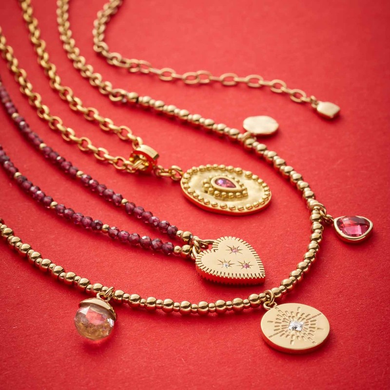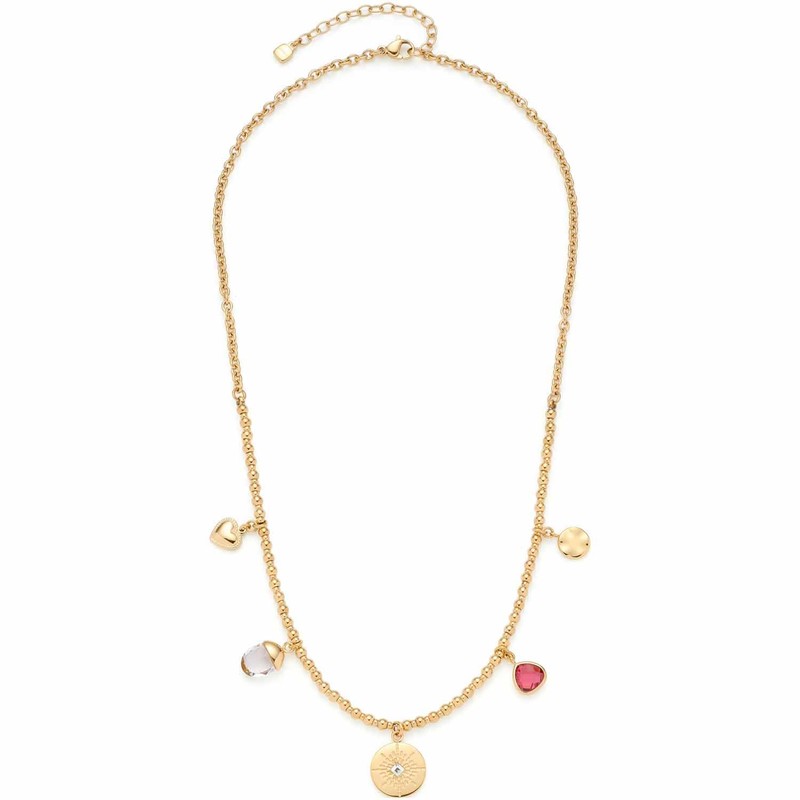 - Material: Kurze Kette aus Edelstahl mit goldener Ionenplattierung. Der runde Anhänger mit kleinem Kristall in der Mitte des Colliers wird eingerahmt von einem ovalen Bergkristall, einem pinken Glaskristall, einem Plättchen und einem Herz aus Edelstahl.