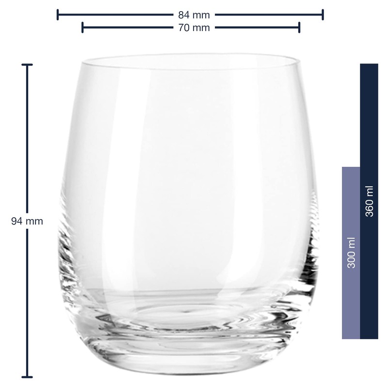 - Dimensions: the goblet dimensions correspond to the standard with (W) 84 x (H) 94 mm, glass rim (W) 70 mm. The total height of the glass is 94 mm, the maximum capacity is approx. 360 ml and the weight at approx. 140 g
