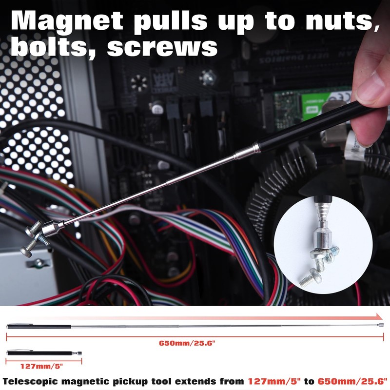 - MAGNETIC PICKUP TOOL: telescopic magnetic pickup extendable from 127mm to 650mm. So you can find metal nuts, bolts, screws and other metal parts even in tight spaces.