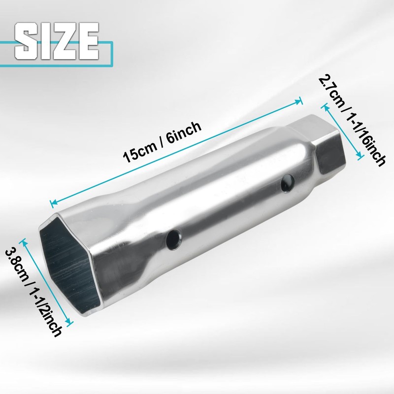 - 2-in-1-Sechskantschlüssel: ein Ende der Größe 1-1/2 Zoll Sechskant entfernt die meisten einschraubbaren Warmwasserbereiter-Elemente; ein anderes Ende Größe 1-1/16 Zoll Sechskant entfernt alle 3/4 Zoll Gewinde-Anodenstangen. Ermöglicht eine einfache Wartung von Warmwasserbereitern