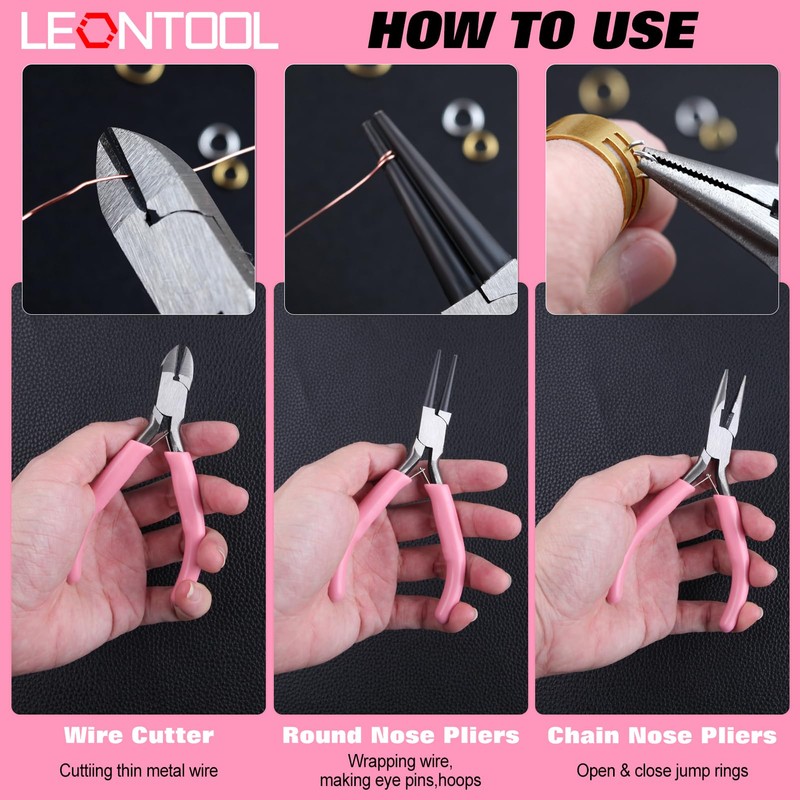 - 3 Types Jewelry Pliers: Chain nose pliers have serrated jaws and cutter function, ideal for grabbing small objects in narrow spaces, and bending or cutting soft metal wires. Round nose pliers have smooth conical jaws, suitable for thin wire looping, bending. Ideal for making earrings, eye pins, jump rings, etc. Wire cutter is ideal for cutting soft materials such as flexible wire, aluminum wire, soft alloy wire, cable ties, guitar strings, jewelry wire, trimmed plastic parts, etc.