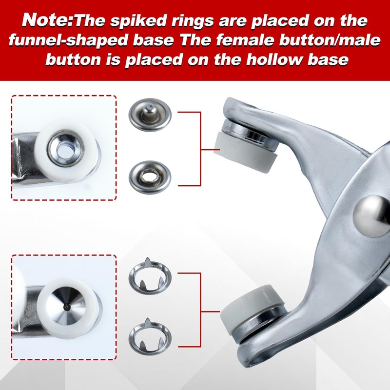 - Instructions and Warm Tips: 2 spiked ring, 1 female socket, 1 male stud as a set. The spiked ring are placed on a solid, funnel-shaped base, and the female socket (male stud) is placed on a hollow base. This snap is a small size and is not suitable for thick (>3mm thick), stiff or dense fabrics or silks.