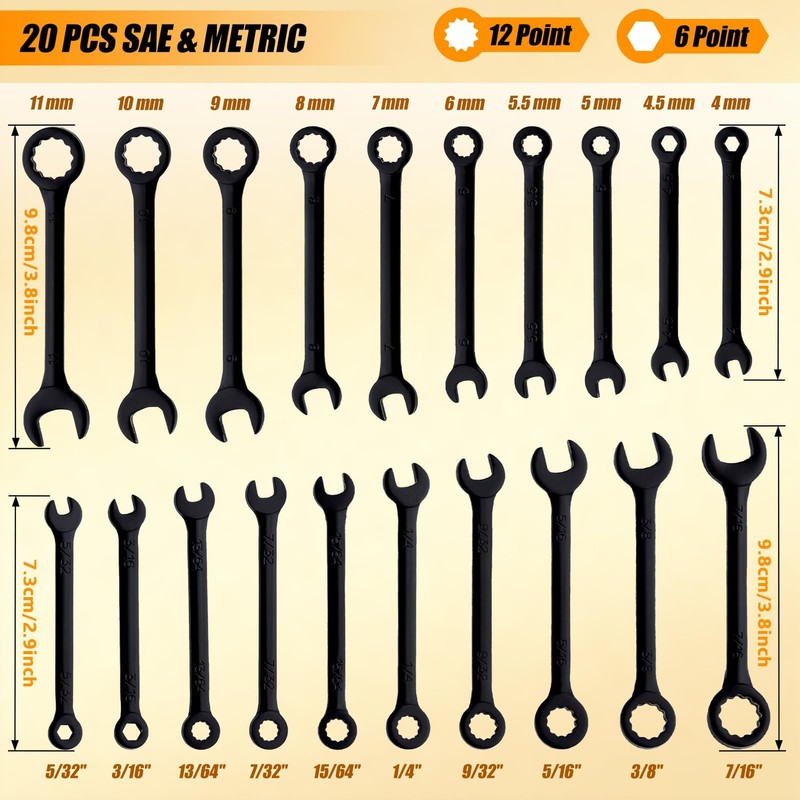 - 20 Piece Wrench Set: 10 SAE: 5/32", 3/16", 13/64", 7/32", 15/64", 1/4", 9/32", 5/16", 3/8", 7/16"; 10 Metrics: 4mm, 4.5mm, 5.5mm, 6mm, 7mm, 8mm, 9mm, 10mm, 111mm ; Clear on both sides of handle Size mark for easy identification