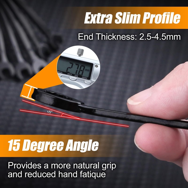- Design: 15° angled box end for normal use and provides optimal space for hand movement when used in tight spaces. Box End: 4 pcs 6 pt, 16 pcs 12 pt