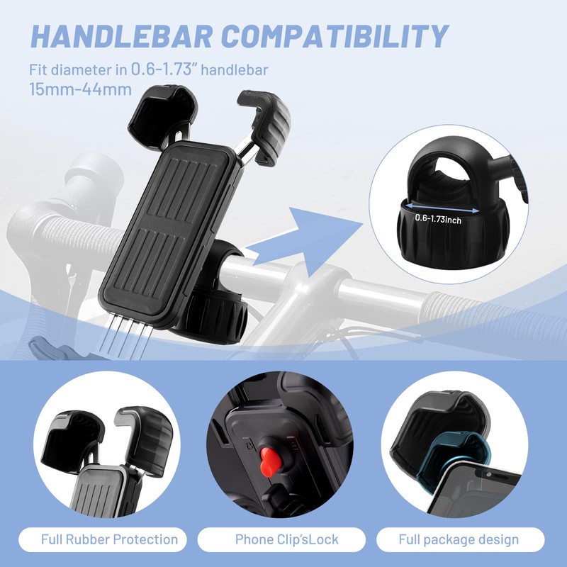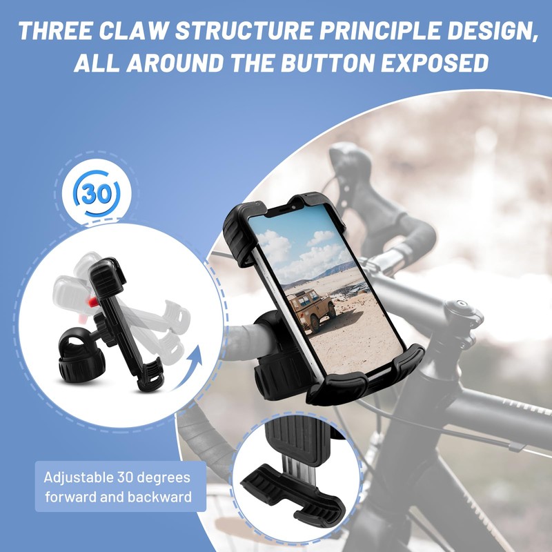 • 【360° FREE ROTATION】Our cell phone holder has a 360° rotation function, you can rotate your cell phone horizontally, vertically or at any angle to answer calls, play music, or use GPS positioning even during riding.