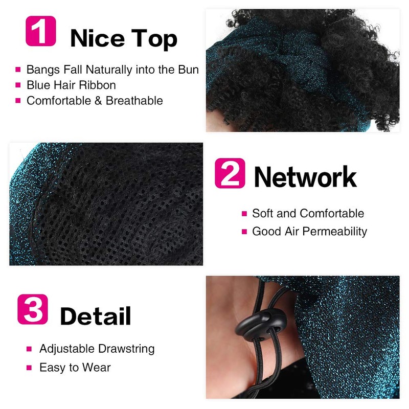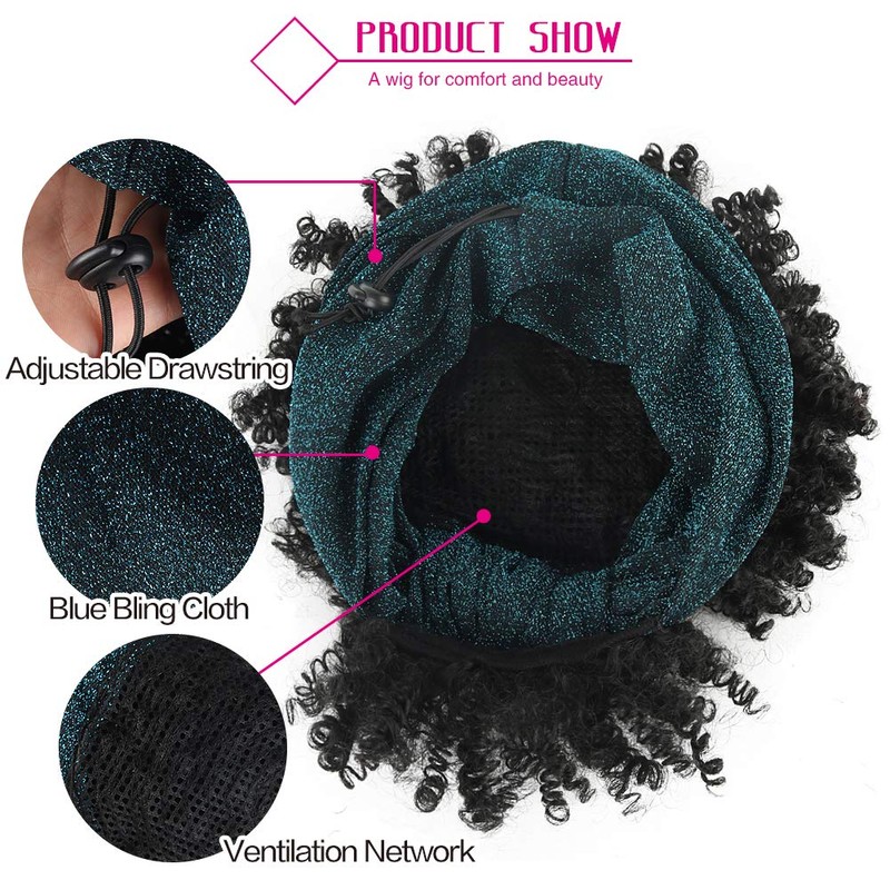 - 【About Headband Wigs】:Afro Puff Head-Wrap Wig,2 in 1 Wrap-Wig,Length: About 4 Inches; Weight: 160g;Colors:1B#; Blue Headband,Scarf material is comfortable, good air permeability.