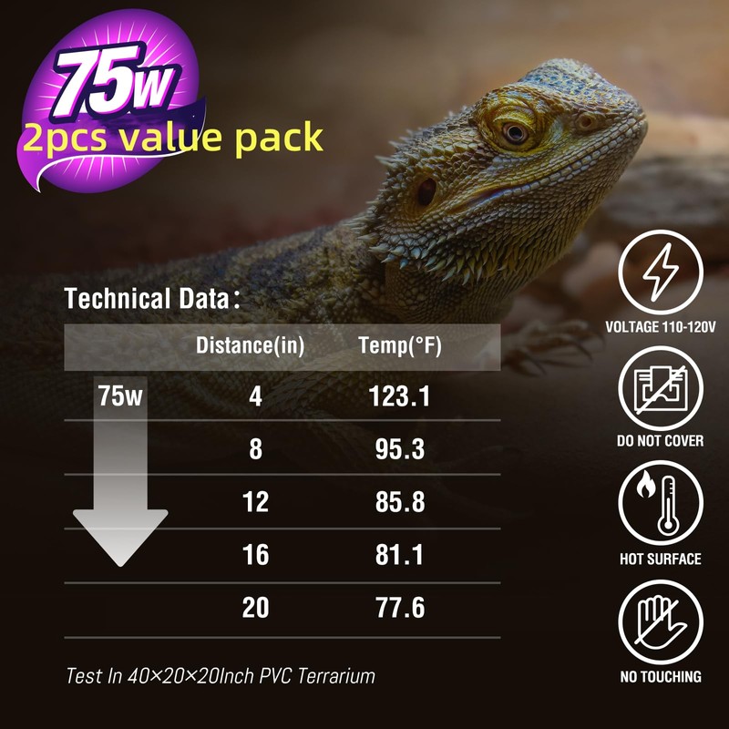 Package Include 2pcs 75w Basking Bulbs for Reptiles Our Incandescent Basking light Bulbs Bright and Durable, Provide a Good Living Environment For Reptiles And Provide a Good Viewing Environment For Owners, Fun Raising A great source of heat for Ectothermic species,Can be used with a thermostatic control system