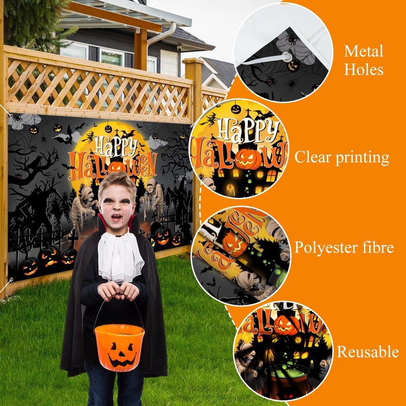 Our Halloween banner is made of premium polyester cloth, brightly colored, clear images, washable, reusable and durable, no smell, with flat surface, smooth edges, hard to fade or break. They can be kept and used for a long time.