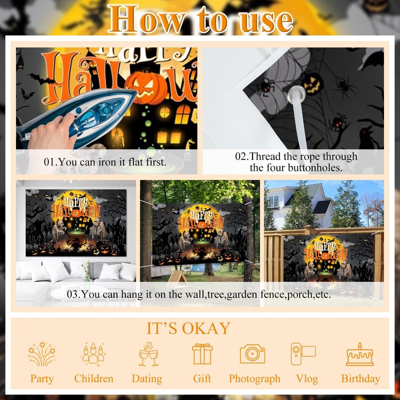 - Upgraded Friendly Design: The new design is easy to hang, the Happy Halloween backdrop has 4 grommets at the corners and comes with two 6 M long strings so you can hang it anywhere you want to decorate, such as walls, doors, garage covers or windows. A different and special wall or outdoor halloween decorations, Perfect for adult, kids, men, women of any age.