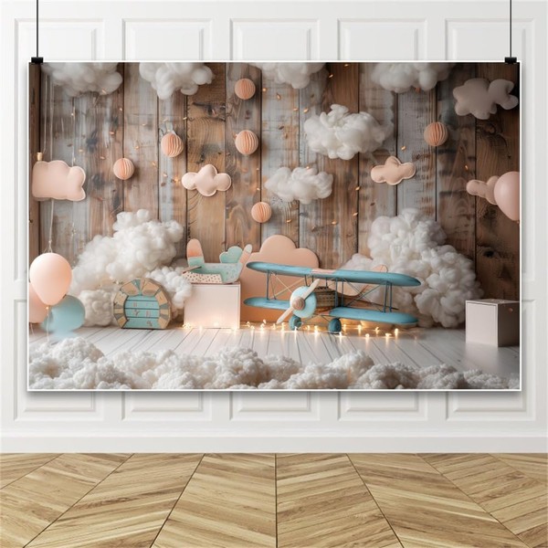 Leowefowa Wooden Toy Airplane Boy Backdrop 10x8ft Boy Birthday Banner Clouds Furry Blanket Backdrops for Photography Newborn Baby Shower Backdrops for Parties Cute Clouds Photo Props