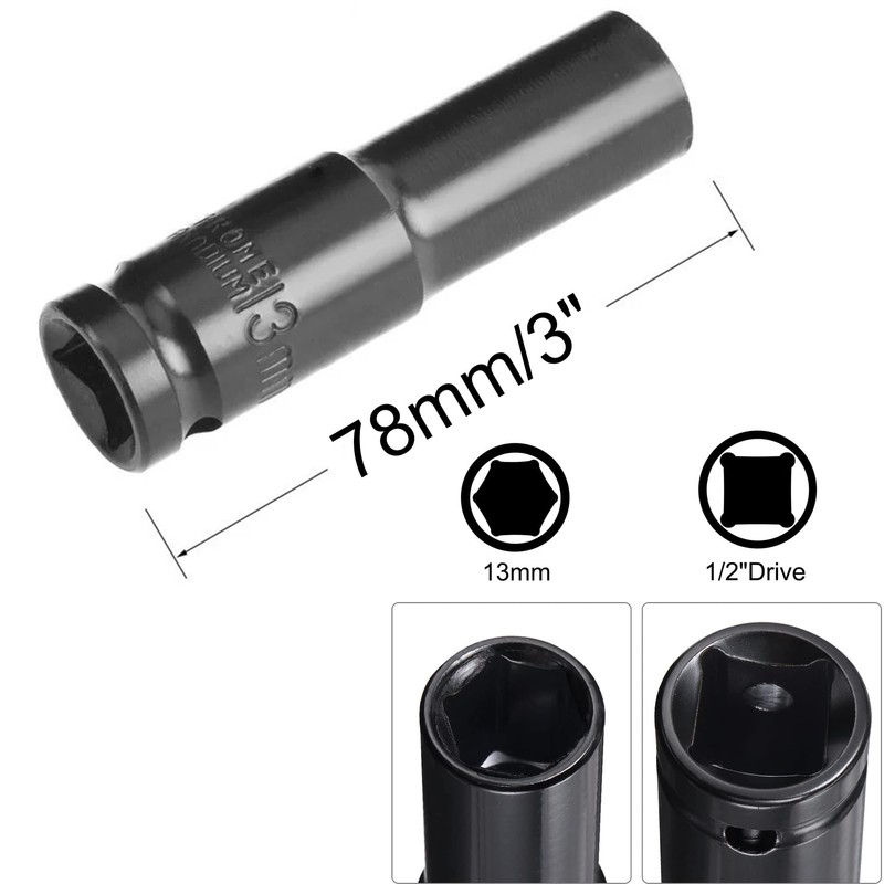 - Size: 1/2" drive 13mm 6-point socket, 3" total length; 1/4" hex shank, 2.87" length socket adapter.