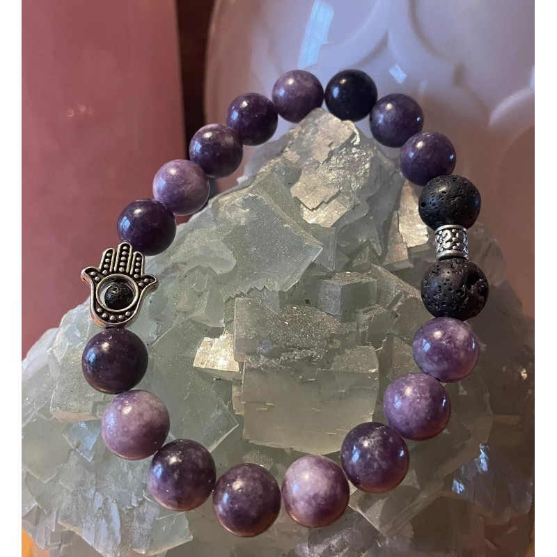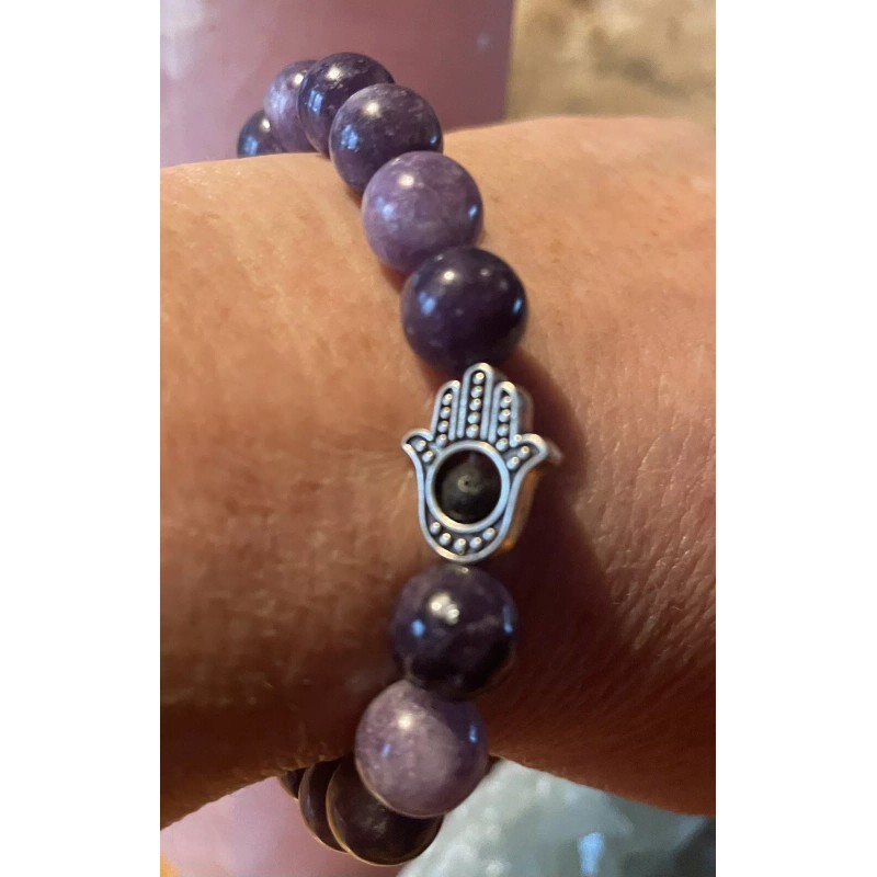 Lepidolite Natural Hamsa Hand Aromatherapy Lepidolite Beads Bracelet 8mm Handmade In USA